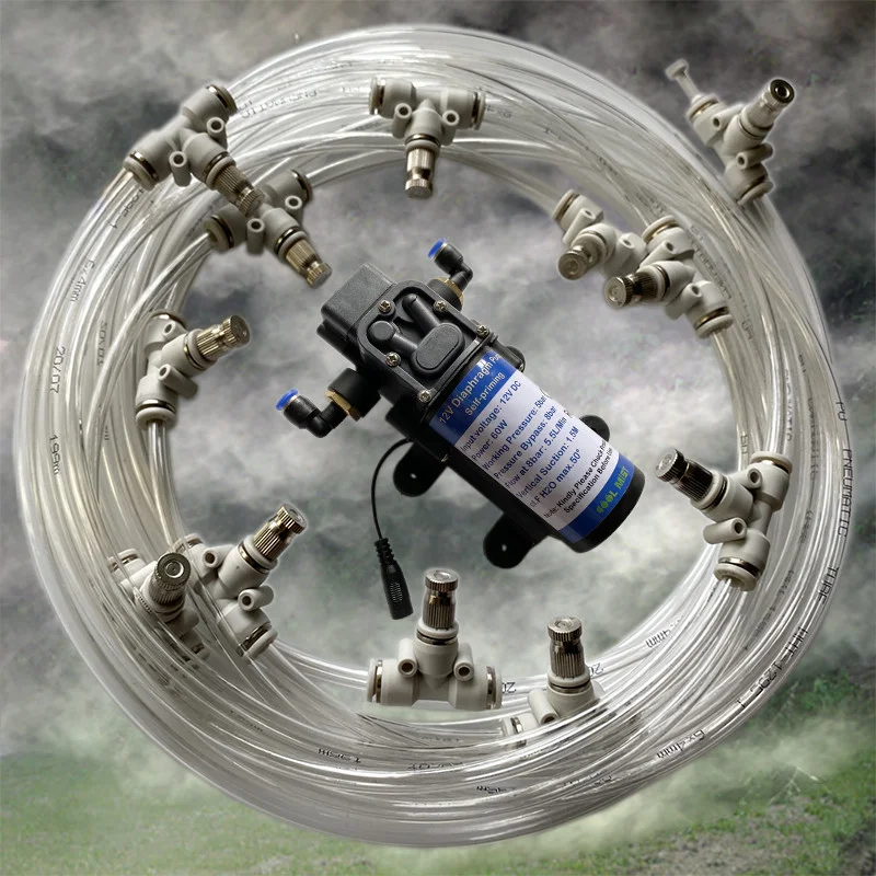 - Bomba de diafragma de 12V y 60W, sistema de nebulización artesanal de 10M, máquina de niebla, Kit de rociador de agua para Patio al aire libre, humidificación de refrigeración de jardín