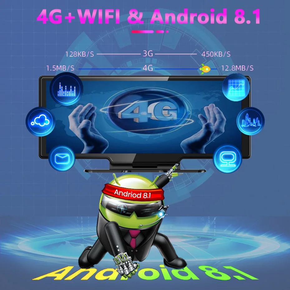 - Cámara de salpicadero con grabadora de vídeo 4G, espejo retrovisor de 10 “, Android 8,1, navegador GPS, WIFI, DVR, cámara de vigilancia